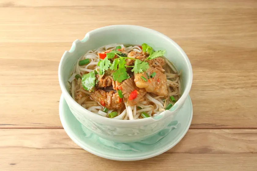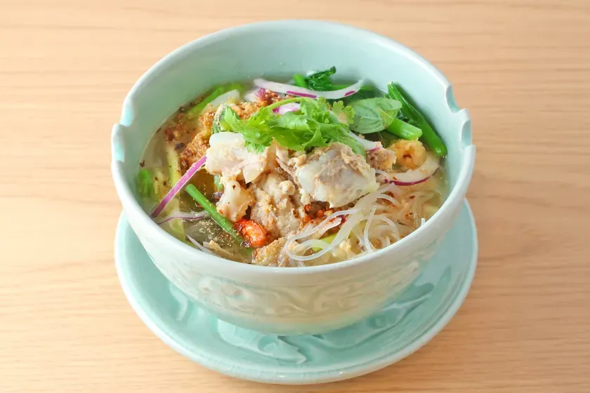 タイの屋台料理の定番、タイラーメンも、平田牧場三元豚の豚なんこつでワンランク上の味わいに昇華しました。澄み切った出汁にタイの調味料が複雑に絡み合うスープは、一口ごとにその奥深さに魅了されます。