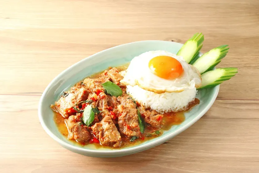 注目すべきは、千葉県市原市の自社農場「スースー・アグリ」で育ったフレッシュなタイの赤唐辛子(プリックデーン) やバイガパオ(ホーリーバジル) が惜しみなく使われている点。一口食べると、ハーブの力強い香りがふわっと広がり、その後に続く豚なんこつのコリコリとした食感と、上品な脂の甘みがたまらないハーモニーを奏でます。半熟の目玉焼きを崩して全体に絡めれば、まろやかなコクが加わり、さらに奥深い味わいに変化。食べるたびに、きっと笑顔になっちゃいますよ!
