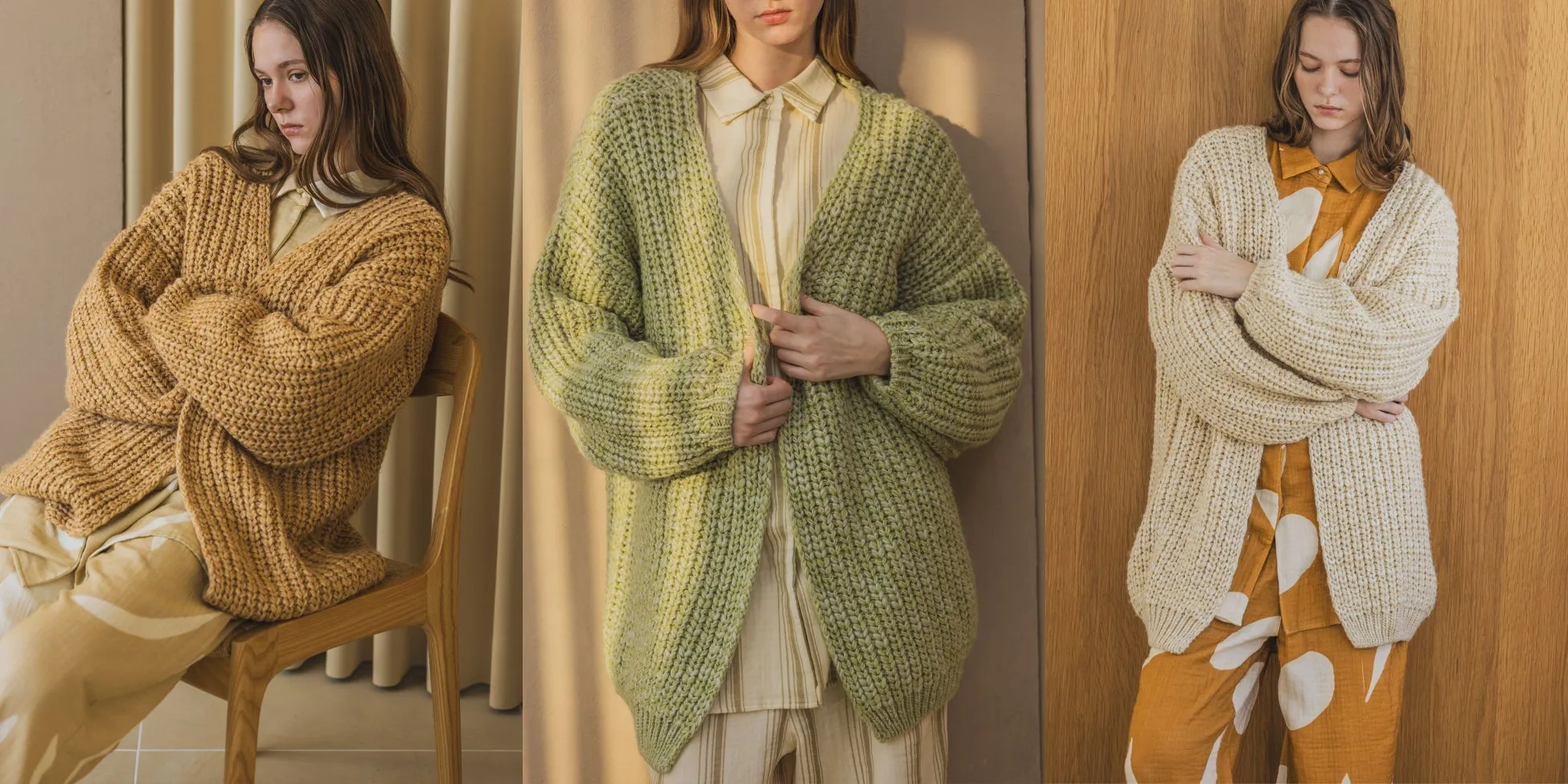 寒くなるこれからの季節に欠かせないニットカーディガンも登場。写真のモデルさんたちが着こなしているように、オーバーサイズでゆったりとしたシルエットが、こなれ感を演出してくれそうです。羽織るだけで、普段着が一気に洗練された印象に変わるはず。カジュアルにもきれいめにも合わせやすいデザインは、ワードローブの強い味方になること間違いなしですね。着心地の良さにも期待したいです!